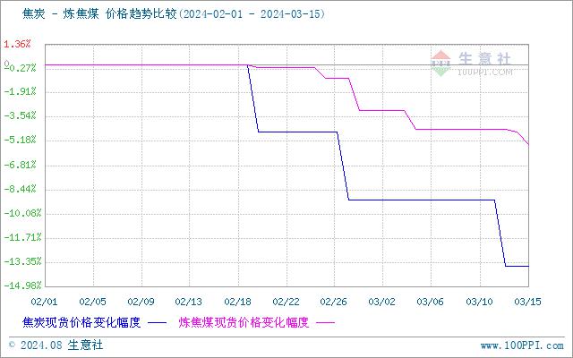 据生意社商品行情分析系统:2024年3月8日至3月15日山西地区焦炭市场第五轮提降落地,截止3月15日准一级冶金焦出厂价格1923.33元/吨,跌1.94%。