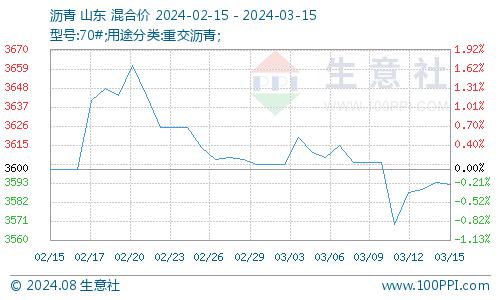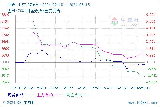 据生意社商品行情分析系统,3月11日至15日,山东地区沥青价格自3569元/吨上涨至3592元/吨,涨幅0.64%,环比下跌0.24%,同比下跌7.57%。当前刚需较为冷清,沥青现货低价交投气氛尚可,高价需求一般。市场复苏缓慢,价格推涨动力不足,沥青整体表现偏弱运行。