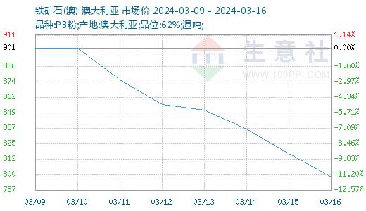 据生意社商品行情分析系统显示,本周(3.9-3.16,下同)铁矿价格小幅下跌、趋弱运行。截至16日,生意社铁矿价格指数为798.22,环比下跌11.43%,具体如上图。本周铁矿价格小幅下跌,整体趋弱运行,其主要原因先是刚结束的“两会”并没有传来利好的宏观消息;其次下游钢材成交表现不及市场预期,成材终端低迷负反馈到原料端,钢厂铁水产量下降,抑制铁矿石需求,引发投机市场看空情绪高涨,做空操作不断。期货行情下跌,加上钢厂复产规模较小,铁矿需求释放情况不及市场预期的积极,导致现货价格走跌;而原料价格下跌又影响到成材价格,恶行循环下带动黑色系整体行情走弱,本周铁矿基本面趋向供增需弱局面,钢厂低位的利润情况限制钢厂开工积极性,铁水产量下降,铁矿期货价格下跌后,带动铁矿价格走跌,所以本周铁矿价格偏弱运行。
