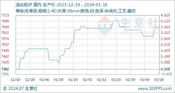 3月18日,生意社涤纶短纤基准价为7642.00元/吨,与本月初(7632.00元/吨)相比,上涨了0.13%。