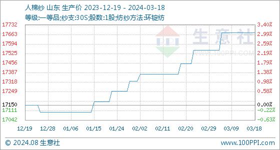 3月18日,生意社人棉纱基准价为17675.00元/吨,与本月初(17550.00元/吨)相比,上涨了0.71%。