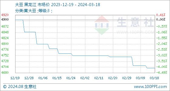 3月18日,生意社大豆基准价为4700.00元/吨,与本月初(4746.00元/吨)相比,下降了-0.97%。