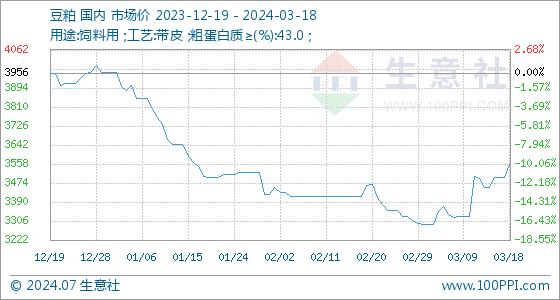 3月18日,生意社豆粕基准价为3500.00元/吨,与本月初(3296.00元/吨)相比,上涨了6.19%。