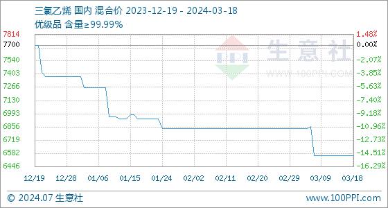 3月18日,生意社三氯乙烯基准价为6560.00元/吨,与本月初(6840.00元/吨)相比,下降了-4.09%。