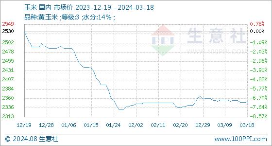3月18日,生意社玉米基准价为2350.00元/吨,与本月初(2358.57元/吨)相比,下降了-0.36%。