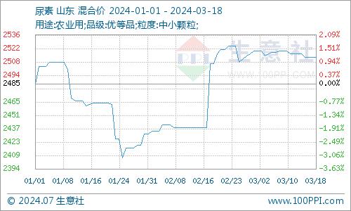 本周(3.11-3.18)尿素市场行情窄幅整理,对氯化铵影响较弱。据生意社商品行情分析系统显示,截至3月18日尿素价格在2513元/吨,较上周一的2516元/吨小幅下跌0.13%。当前尿素市场供需错配,尿素日产量在18万吨左右,但农业方面需求转弱,局部存在有价无市的状态,尿素价格弱势整理。