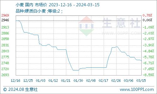 进入3月中旬,受终端面粉需求进入消费淡季影响,厂家开工率有所下降,完成收购任务后持续下调小麦收购价格,加之政策小麦持续出库保供稳价以及进口小麦持续到港,国内小麦市场整体供应转向宽松局面,国内小麦市场价格整体承压偏弱运行。