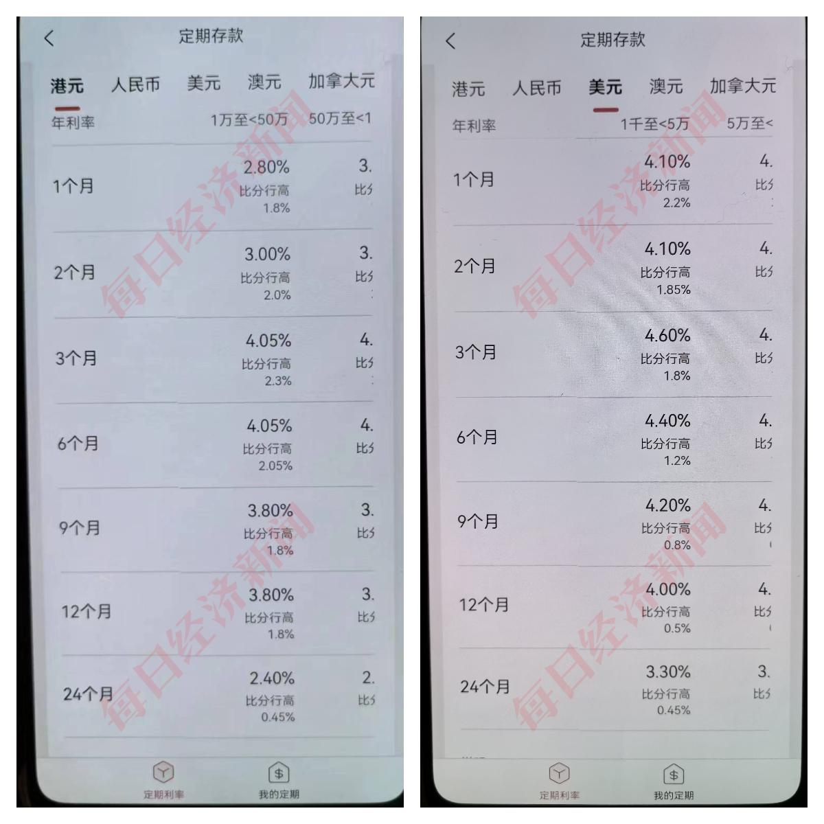 不同银行利率不一。深圳建行一支行工作人员表示,美元定期方面,1个月的年化利率是0.2%,3个月是0.3%,半年是0.5%,一年和两年都是0.8%。港元定期方面,1个月是0.1%,3个月是0.2%,六个月是0.4%,一年和两年都是0.7%。