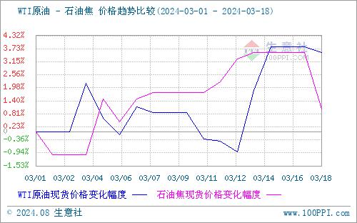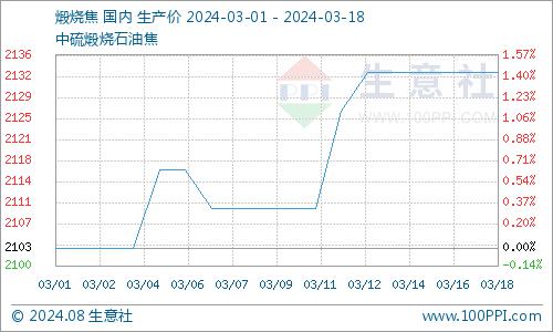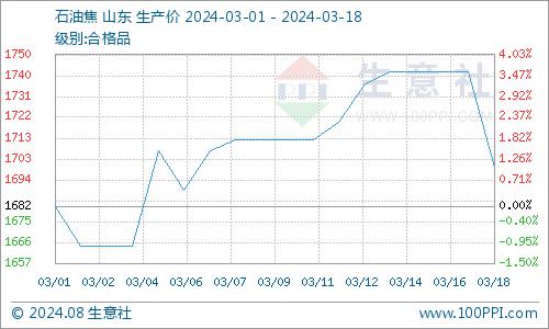 据生意社商品分析系统显示,本周地炼石油焦价格先涨后跌,截止到3月18日山东市场地炼石油焦价格为1700.00元/吨,较3月11日1712.50元/吨下跌0.73%。