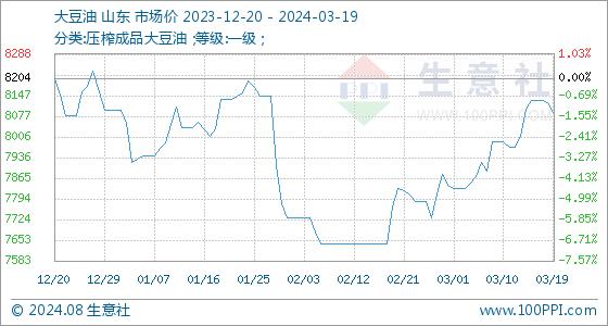 3月19日,生意社大豆油基准价为8124.00元/吨,与本月初(7840.00元/吨)相比,上涨了3.62%。