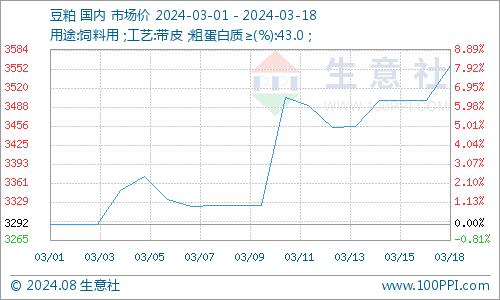 据生意社商品行情分析系统显示:3月开始,利多因素不断显现,国内豆粕行情持续振荡走高,市场均价突破3500元/吨,整体涨幅超8%。3月1日,豆粕市场均价3292元/吨,3月18日,豆粕市场均价3558元/吨,上涨8.08%。