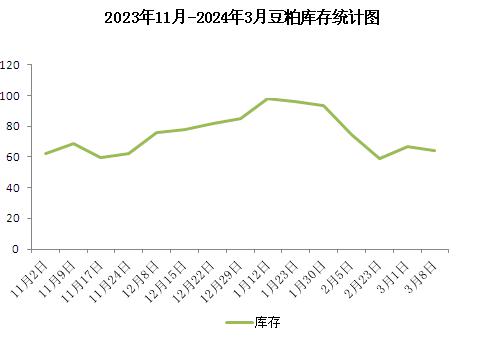 库存:根据2023年11月-2024年3月国内豆粕库存统计图可以看出,进入12月,豆粕库存增速加快。2024年1月豆粕库存再创新高,接近100万吨一线。春节前后,豆粕库存不断走低,截止2月底,豆粕库存跌破60万吨。3月开始,豆粕库存有所回升,依旧处于低位,3月8日当周,豆粕库存约64万吨左右。库存量正值低位,支撑豆粕行情回暖。