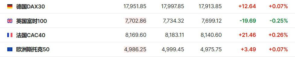 2.截至发稿,德国DAX指数涨0.07%,英国富时100指数跌0.25%,法国CAC40指数涨0.26%,欧洲斯托克50指数涨0.07%。