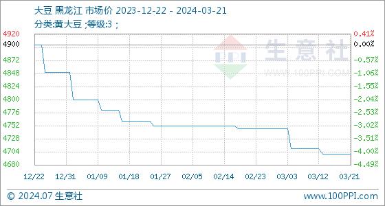 3月21日,生意社大豆基准价为4700.00元/吨,与本月初(4746.00元/吨)相比,下降了-0.97%。