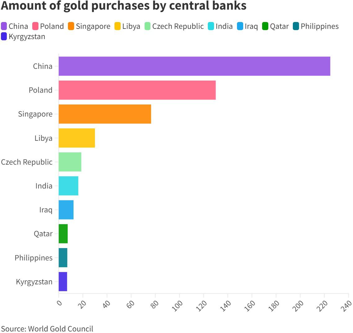 “过去10年,俄罗斯和中国一直是最大的两个买家。然而,近年来央行的购买已经多样化,”花旗北美大宗商品研究主管Aakash Doshi表示。