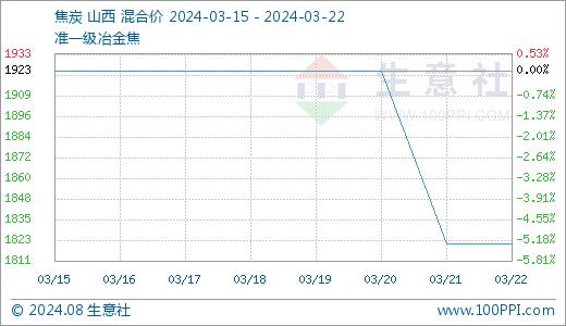 据生意社商品行情分析系统:2024年3月15日至3月22日山西地区焦炭市场第六轮提降落地,截止3月22日准一级冶金焦出厂价格1821.67元/吨,跌5.29%。
