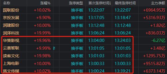 13:00到13:04,多只传媒股拉升涨停,还有华策影视封住20cm三连板,可以说奠定了后续交易时间的基调。