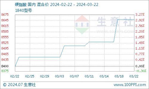 据生意社商品行情分析系统监测硬脂酸1840,3月22日国内主流价格在8650元/吨,,较周上涨1.14%,较3月1日上涨2.37%,较1月上涨5.23%。本周硬脂酸价格涨势绵延。