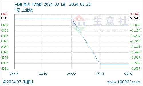 据生意社商品行情分析系统,截止3月22日白油市场均价在8416元/吨,3月18日白油市场均价在8316元/吨,价格较上周下跌0.59%。