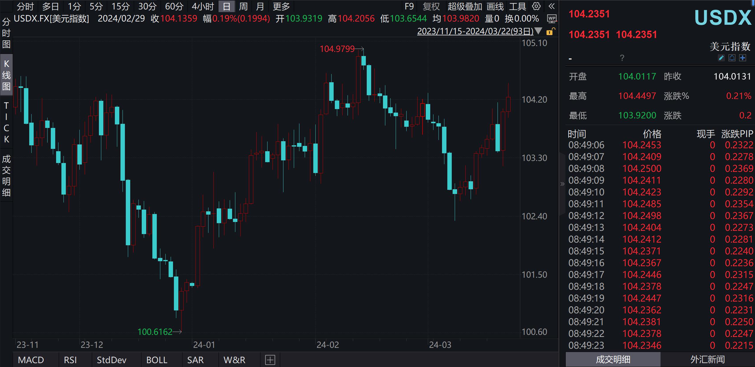 据观察,美元指数近日持续上升,已从3月8日开盘的102.81,上涨至目前的104.42,今日开盘后一路上升。