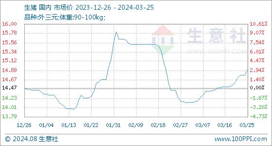 3月25日,生意社生猪基准价为14.78元/公斤,与本月初(14.12元/公斤)相比,上涨了4.67%。