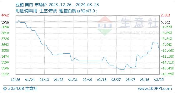 3月25日,生意社豆粕基准价为3670.00元/吨,与本月初(3296.00元/吨)相比,上涨了11.35%。