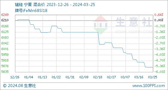 3月25日,生意社锰硅基准价为5870.00元/吨,与本月初(6011.67元/吨)相比,下降了-2.36%。