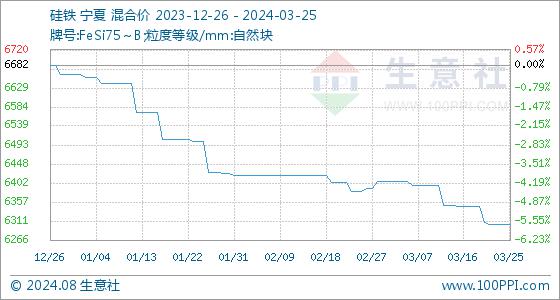 3月25日,生意社硅铁基准价为6304.29元/吨,与本月初(6407.14元/吨)相比,下降了-1.61%。