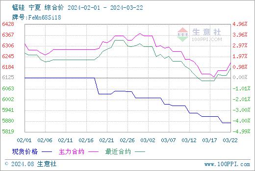 近期钢招价格持续下移,钢厂需求表现较差,厂家出货难度较大,出现持续累库情况,部分厂家选择进行停产检修,目前硅锰整体产量处于较低位置,厂家观望心态较浓,本周硅锰现货市场偏弱运行。据生意社商品行情分析系统,硅锰宁夏地区(规格为FeMN68Si18)3月22日市场报价5800-5950元/吨左右,较上周下调20-50元/吨不等。
