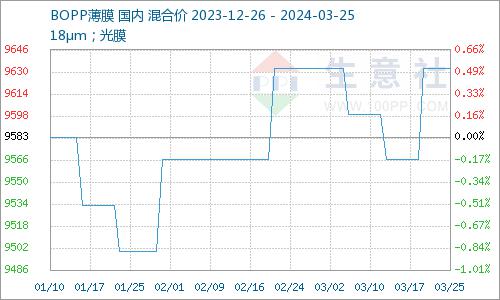 据生意社商品行情分析系统显示,本周BOPP市场行情价格震荡上涨。截止3月20日,国内生产商、贸易商18μm的BOPP光膜的主流报盘价格在9633元/吨左右,较上周均价涨幅约0.7%,较月初均价基本持平。行情分析