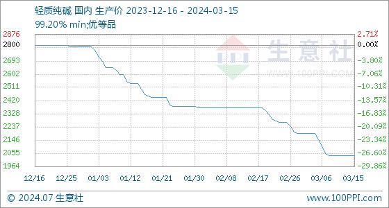 3月15日,生意社轻质纯碱基准价为2040.00元/吨,与本月初(2190.00元/吨)相比,下降了-6.85%。