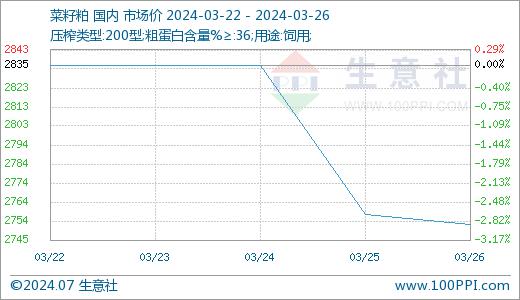 25日菜粕现货价格:均价2758元/吨,较上一交易日下跌2.7%。25日菜粕期现货均下跌,郑菜粕期货下跌3.57%,拖累现货行情随之下跌。3-4月份国内进口菜籽到港数量预计提升,菜粕供应压力增加。水产养殖处于需求淡季;加之25日豆粕现货单日跌幅接近3%;4月中下旬将迎来水产需求旺季,短期内预计菜粕震荡偏弱运行为主。