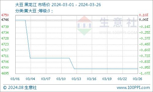 据生意社商品行情分析系统显示:3月以来,国产大豆行情整体弱势平稳,3月1日,国产大豆市场均价4746元/吨,3月26日,国产大豆市场均价4700元/吨,价格下跌0.97%。