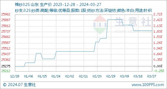 3月27日,生意社棉纱32S基准价为25750.00元/吨,与本月初(25900.00元/吨)相比,下降了-0.58%。