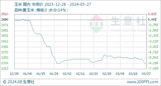 3月27日,生意社玉米基准价为2332.86元/吨,与本月初(2358.57元/吨)相比,下降了-1.09%。