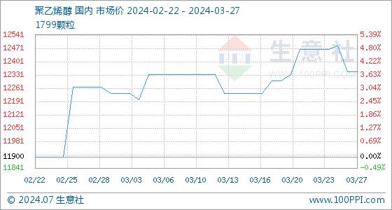 3月27日,生意社聚乙烯醇基准价为12350.00元/吨,与本月初(12266.67元/吨)相比,上涨了0.68%。