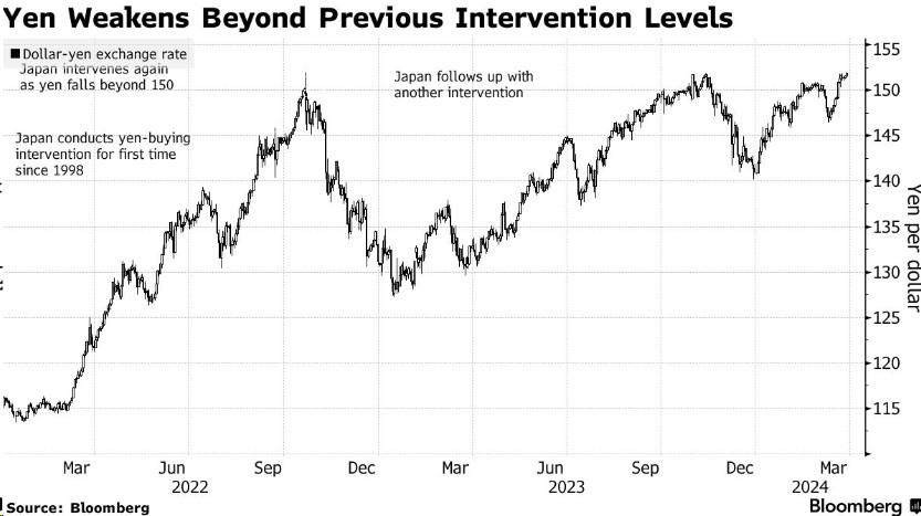 日本在2022年9月和10月的三次入市干预行动中花费了超过9万亿日元(593亿美元)来支撑日元。其中,第一次干预是在日元汇率远高于当前水平时进行的。