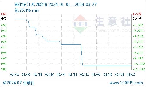 近日(3.18-3.27)氯化铵行情弱势盘整,据生意社商品行情分析系统显示,截至3月27日农业用氯化铵干铵华东地区价格在590元/吨,较前期持平。原料液氨价格大幅上涨,氯化铵成本面支撑走强;尿素价格弱势下行,对氯化铵支撑偏弱;另外氯化铵供应面仍宽松为主,加之国内下游需求偏弱,氯化铵市场整体偏弱运行。截至3月27日国内农业用氯化铵干铵主流出厂价在550~600元/吨;湿铵主流出厂价在450~550元/吨附近。