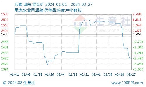近日(3.18-3.27)尿素市场行情小幅走跌,对氯化铵影响偏空。据生意社商品行情分析系统显示,截至3月27日尿素价格在2423元/吨,较11日的2513元/吨小幅下跌3.58%。当前尿素市场供需错配,尿素日产量仍处高位,但农业基层方面零散补单,经销商随用随采,尿素价格弱势走低。