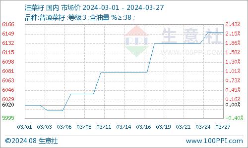 据生意社商品行情分析系统监测,3月国产菜籽价格不断上涨,3月1日国产菜籽市场均价为6020元/吨,3月27日国产菜籽市场均价为6152元/吨,上涨2.19%。受冻雨和暴雪天气影响,对国产新季菜籽有减产预期,支撑行情上涨。国产菜籽随着时间增加国产菜籽货源逐渐减少,市场看涨情绪较重。加之3月前三周国内菜油、菜粕行情不断上涨,提振菜籽行情。临近月末菜油、菜粕行情弱势下跌,对国产菜籽支撑作用减弱。受进口菜籽冲击影响,国产菜籽上调空间有限。