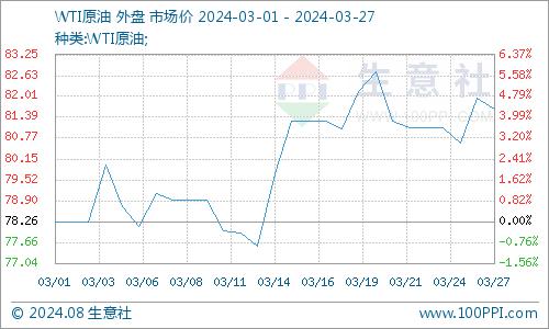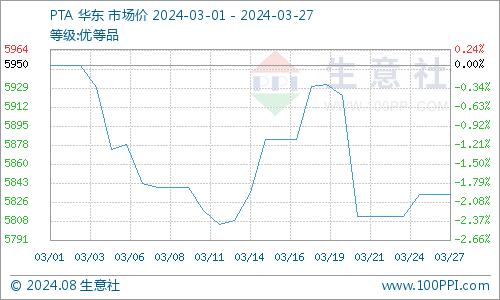 据生意社商品行情分析系统,截止3月27日华东地区市场均价在5833元/吨,较3月初下跌1.97%。PTA货源供应充足,下游聚酯工厂接货意向不佳,叠加下旬原油期货走跌,基本面偏弱与成本支撑双双减弱,3月PTA价格震荡偏弱调整。