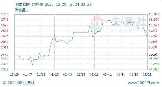 3月28日,生意社甲醇基准价为2636.67元/吨,与本月初(2730.00元/吨)相比,下降了-3.42%。