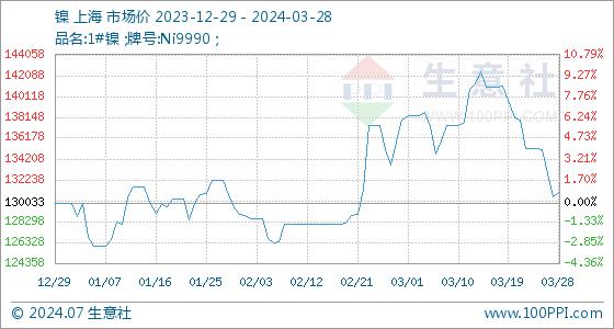 3月28日,生意社镍基准价为130583.33元/吨,与本月初(137850.00元/吨)相比,下降了-5.27%。