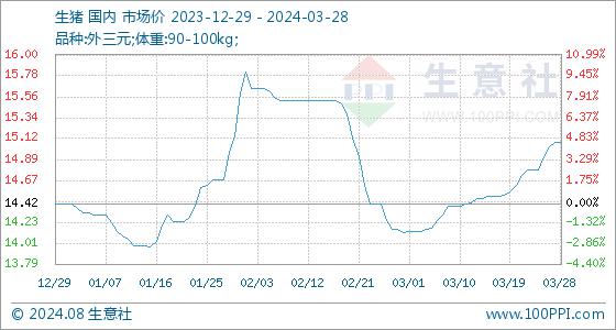 3月28日,生意社生猪基准价为15.08元/公斤,与本月初(14.12元/公斤)相比,上涨了6.80%。