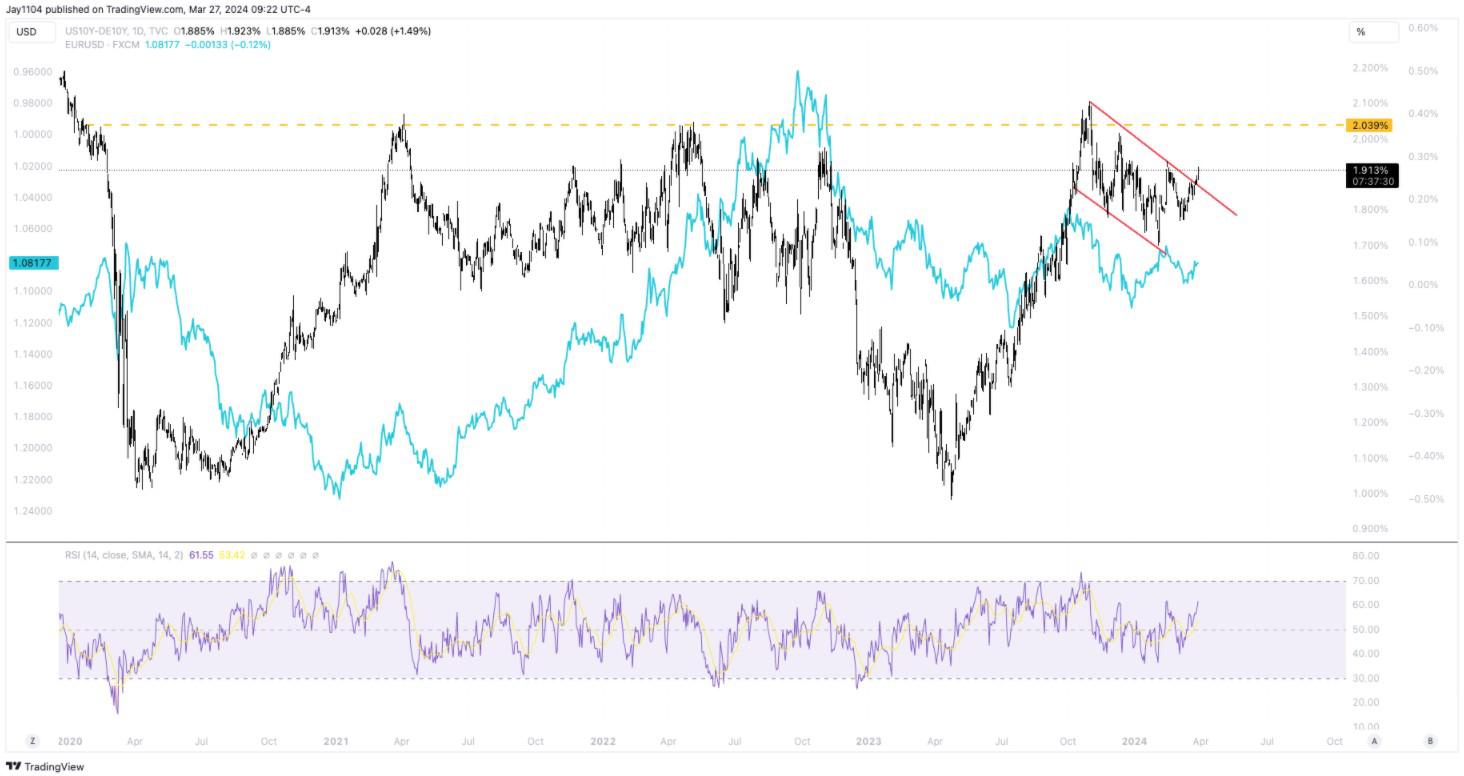 美国和德国10年期国债之间的利差已扩大至1.91%,从技术面来看,这一利差可能进一步走高,有可能达到2.05%。