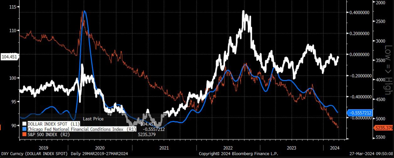 美元走强通常会导致金融环境收紧,而美元走弱则会导致金融环境宽松。一般来说,当金融条件宽松时,股票往往会上涨,而当金融环境收紧时,股票就会下跌。