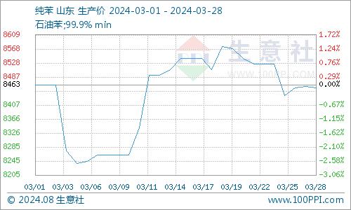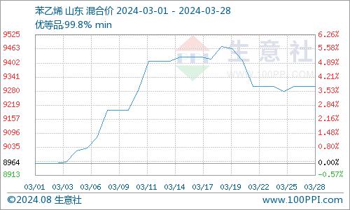 据生意社商品行情分析系统显示,3月1日山东苯乙烯价格在8964元/吨,3月28日价格在9300.00元/吨,月内涨幅3.75%。价格行情最高点出现在3月19日为9474元/吨,较最低点上涨5.69%。