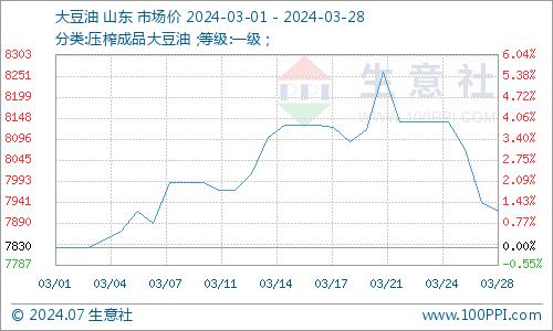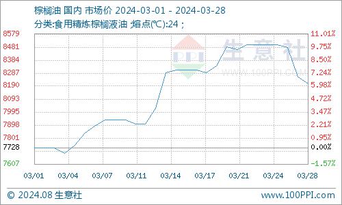 据生意社商品行情分析系统显示:3月,国内豆油棕榈油行情振荡上涨。其中,棕榈油涨幅较大,整体上涨接近7%,豆油上涨超1%。3月1日,豆油市场均价7830元/吨,3月28日,豆油市场均价7920元/吨,上涨1.15%。3月1日,棕榈油市场均价7728元/吨,3月28日,棕榈油市场均价8210元/吨,上涨6.24%。
