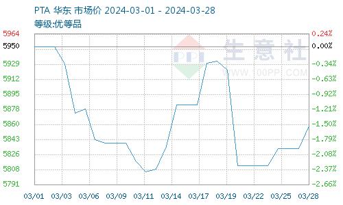 据生意社商品行情分析系统,截止3月28日,PTA报价5833元/吨,较3月1日PTA价格5950元/吨震荡下跌,跌幅1.97%。原油涨至4个月新高,PTA成本支撑较高,PTA开工增多,PTA供给充足,下游纺织企业开工回升速度放缓,聚酯生产工厂持续累库,聚酯工厂接货意向不佳,后市终端纺织市场进入旺季,PTA需求预期回暖。