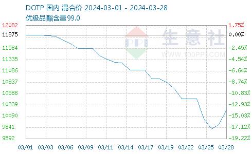 据生意社商品行情分析系统,截止3月28日DOTP价格10225元/吨,较3月1日DOTP价格11875元/吨大幅下跌,跌幅13.89%。原材料异辛醇价格大幅下跌,苯酐价格跌后趋稳,PTA价格小幅震荡下跌,增塑剂成本下降;增塑剂DOTP厂家开工高位稳定,DOTP供给充足,下游PVC厂家去库缓慢,增塑剂刚需采购,增塑剂需求面支撑有限,3月DOTP价格大幅下跌。